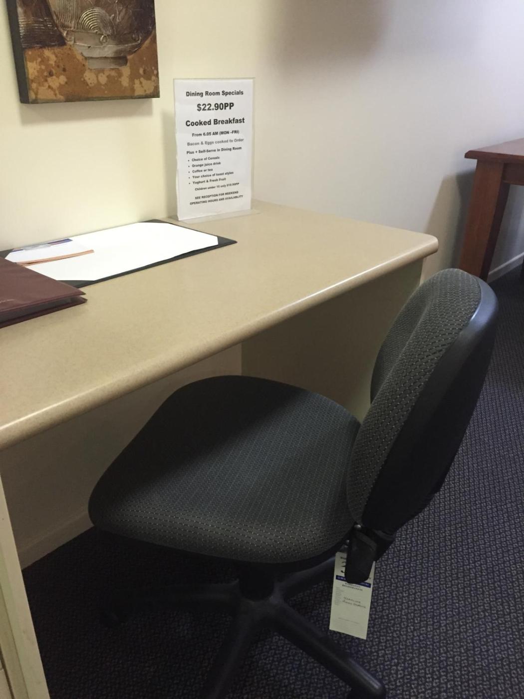 Business Queen Room. This spacious room has parking available and features a leather recliner, large Smart TV and a private courtyard. Also provided are cooking facilities with a microwave, toaster and teacoffee making facilities. There is a 2-person dining setting, a work desk and air conditioning. Guests have access to the pool and BBQ area. An additional rollaway bed can be included if required. ;