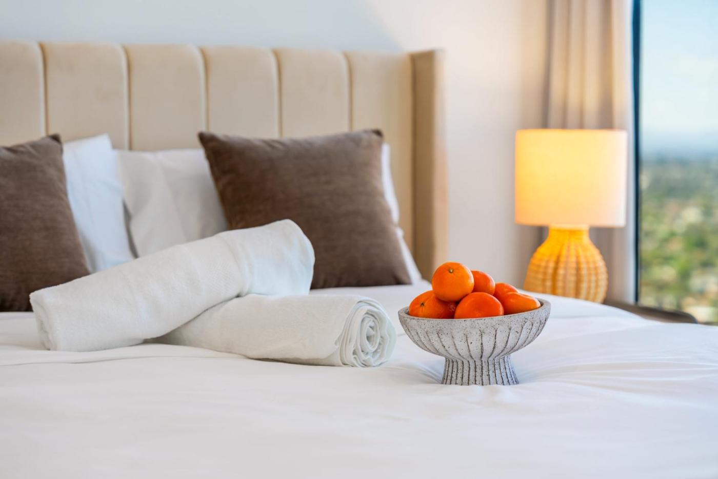 Four-Bedroom Penthouse Apartment. This spacious apartment features a kitchen, a seating area, 4 separate bedrooms and 2 bathrooms with a bath and a shower. In the well-fitted kitchen, guests will find a stovetop, a refrigerator, a dishwasher and kitchenware. The air-conditioned apartment features a flat-screen TV, a washing machine, a dining area, a wardrobe as well as city views. The unit has 4 beds.
