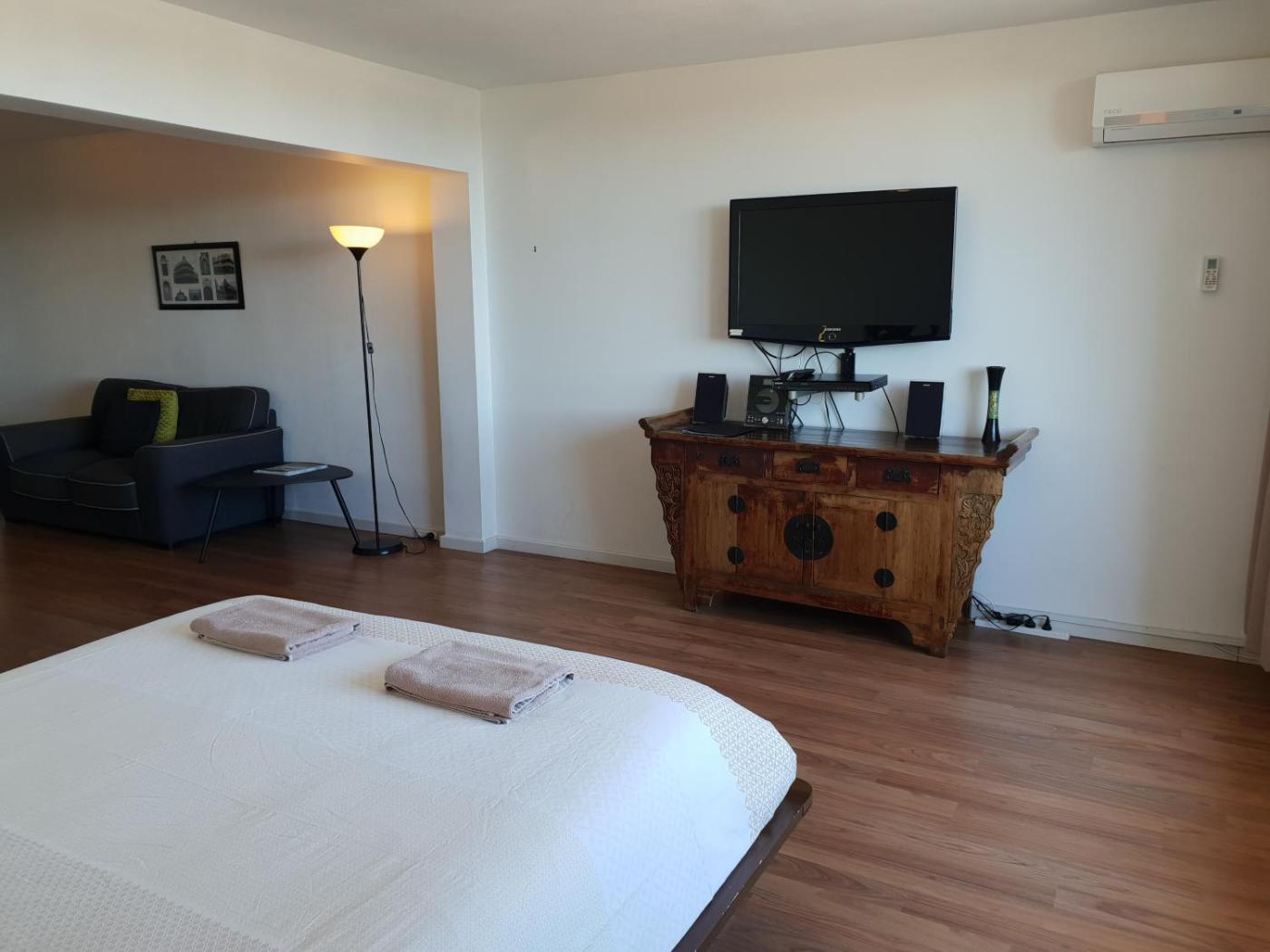 Studio Apartment. Guests can make meals in the kitchen that has a stovetop, a refrigerator, kitchenware and an oven. The spacious studio features air conditioning, a washing machine, a balcony with sea views as well as a private bathroom boasting a walk-in shower. The unit has 1 bed.