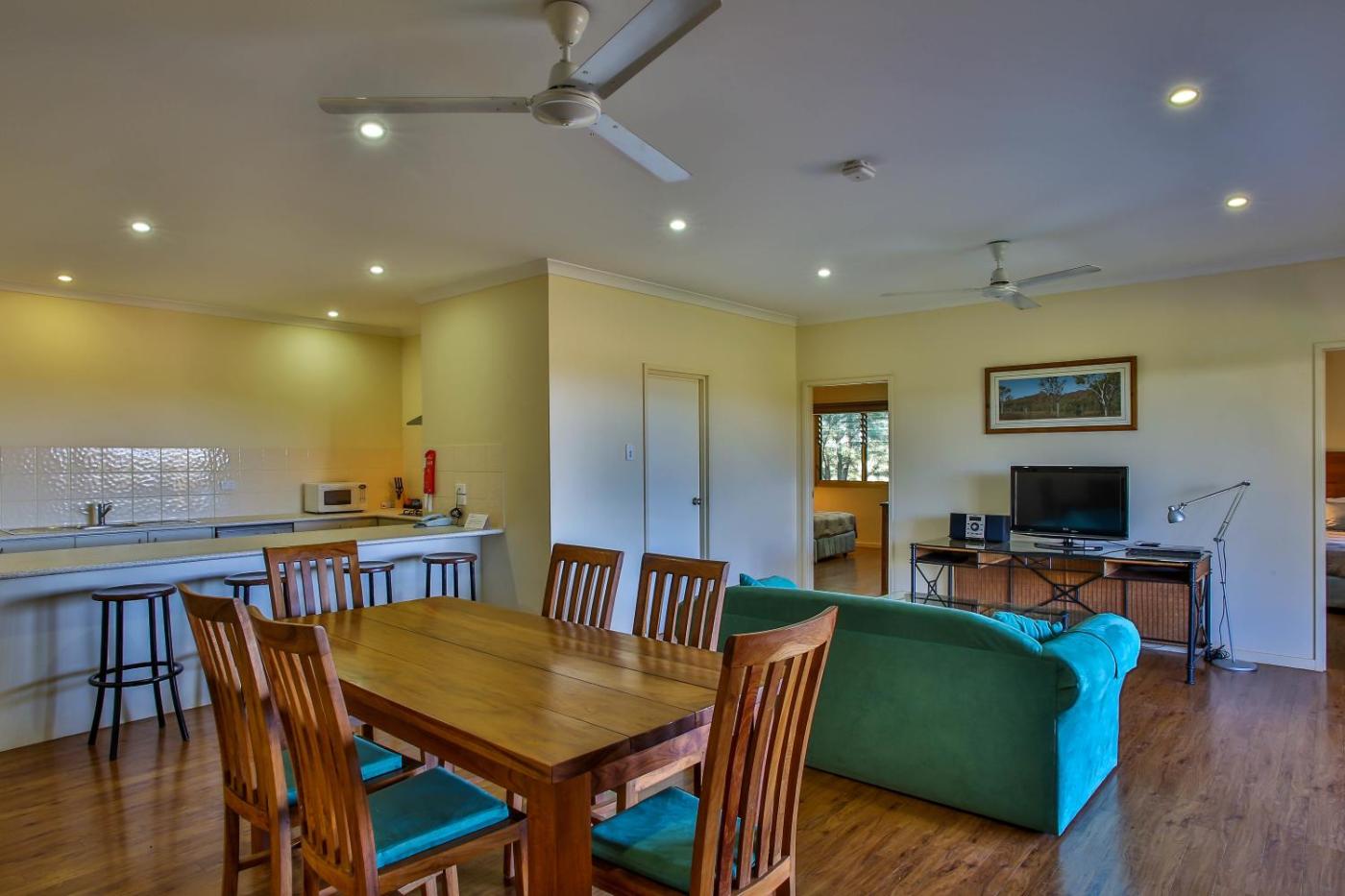 Two-Bedroom Apartment. Modern and stylish apartment with your own private patio area. Includes a full kitchen, dining area, ceiling fan, en suite bathroom, air conditioning, sofa bed, refrigerator, DVD player and cable TV. Please note there is no capacity for additional guests.