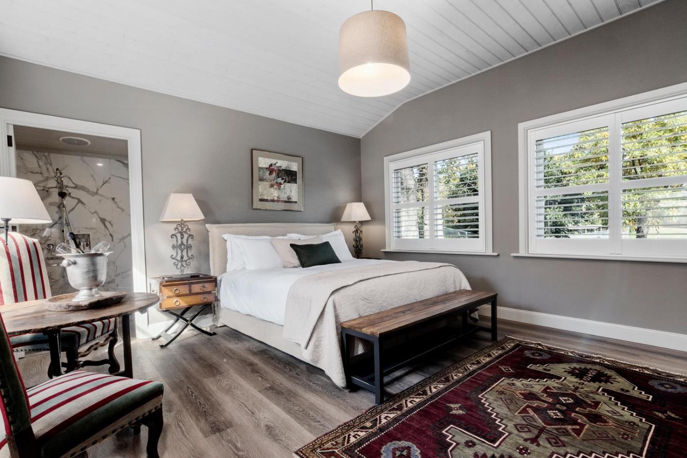 Superior King Suite. The Le Jardin Suite features a private entrance through French doors, opening onto the back carpark and garden. It includes French-styled art and furnishings, air conditioning, a Smart TV and a light-filled bathroom with bath and walk-in shower. ;
