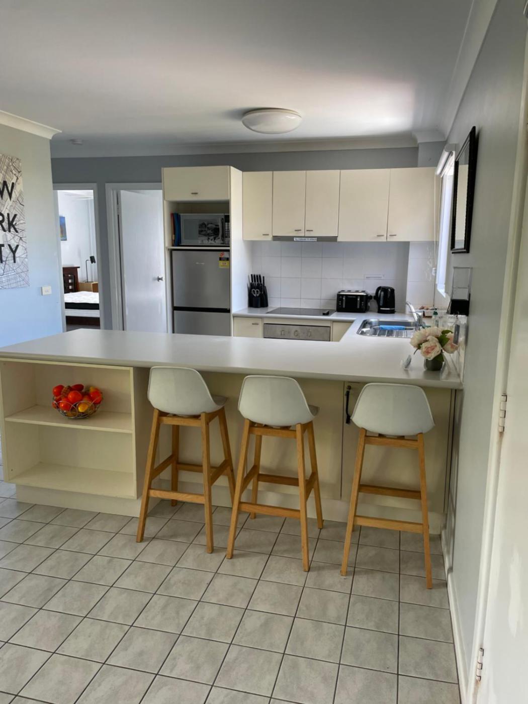 Two-Bedroom Apartment. This apartment features a fully equipped kitchen with a dishwasher. It also includes laundry facilities and a bathroom with a shower.