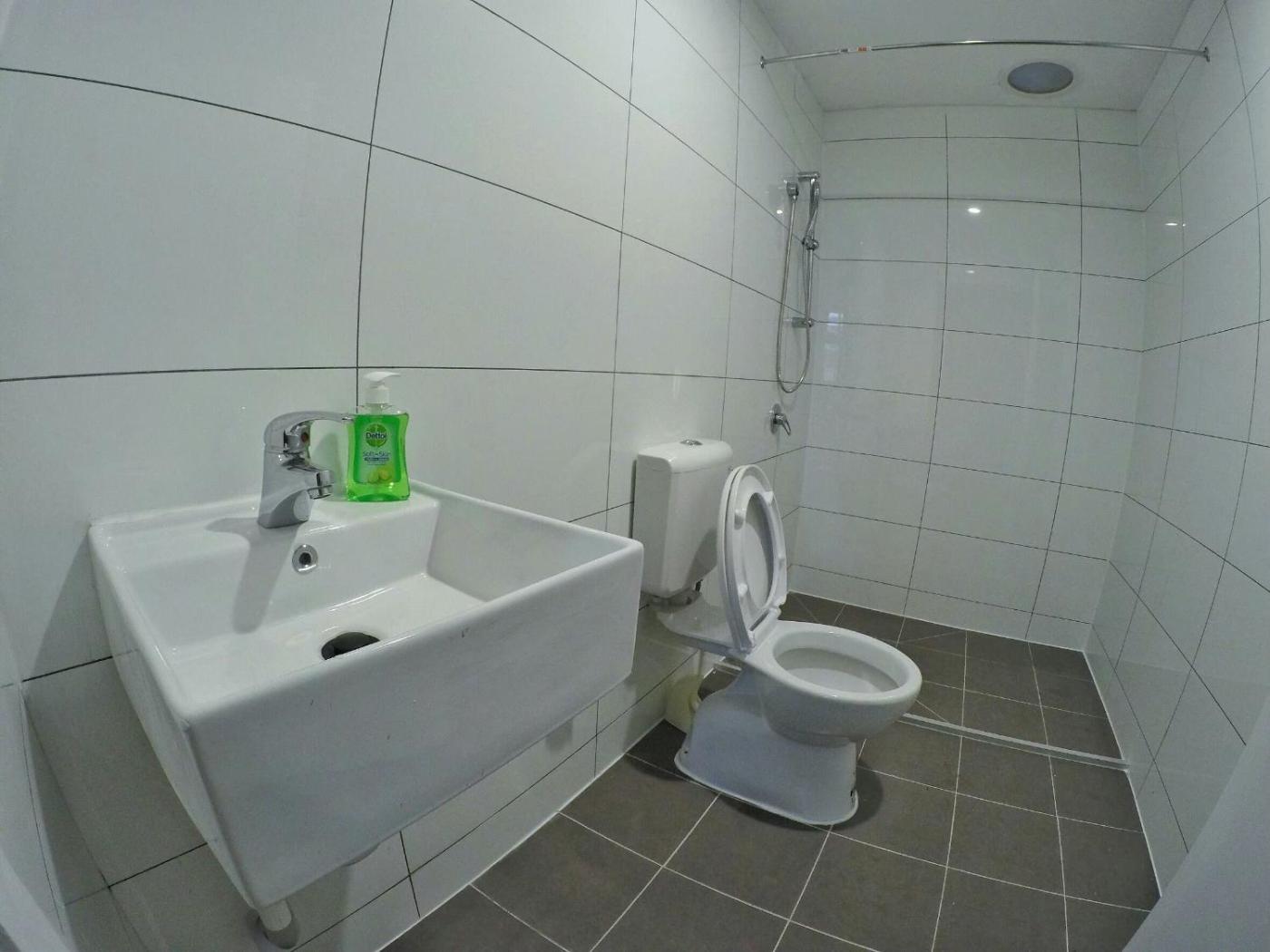 At the hostel, every room has a shared bathroom with a shower.