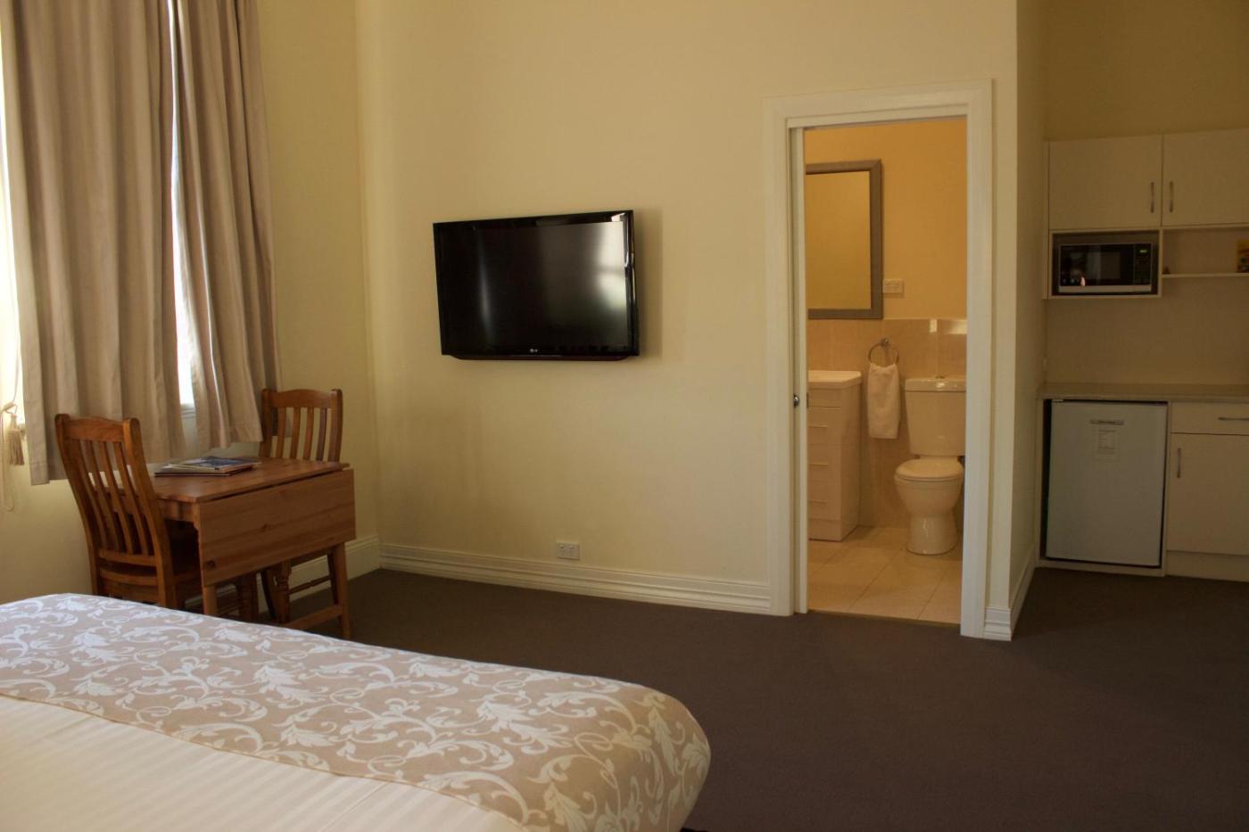 Superior Queen Room. Experience elevated comfort in this beautifully renovated room featuring a plush queen-sized luxury bed, a large LCD TV, and a private ensuite. Enjoy the convenience of your own kitchenette, complete with essential facilities, and a built-in robe with ironing amenities. Climate-controlled for year-round comfort, this suite is centrally located in the heart of the city—just a short stroll from the picturesque Murray River. ;