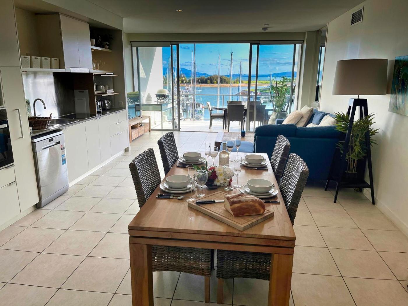 Three-Bedroom Apartment. This 3-bedroom apartment on the top floor overlooks the marina and Nelly Bay. The main bedroom has its own private en suite and bath. The apartment has a large open plan living and dining area and is fully air conditioned. It is self-contained with a kitchen, laundry, 2 bathrooms and outdoor dining area overlooking the marina.