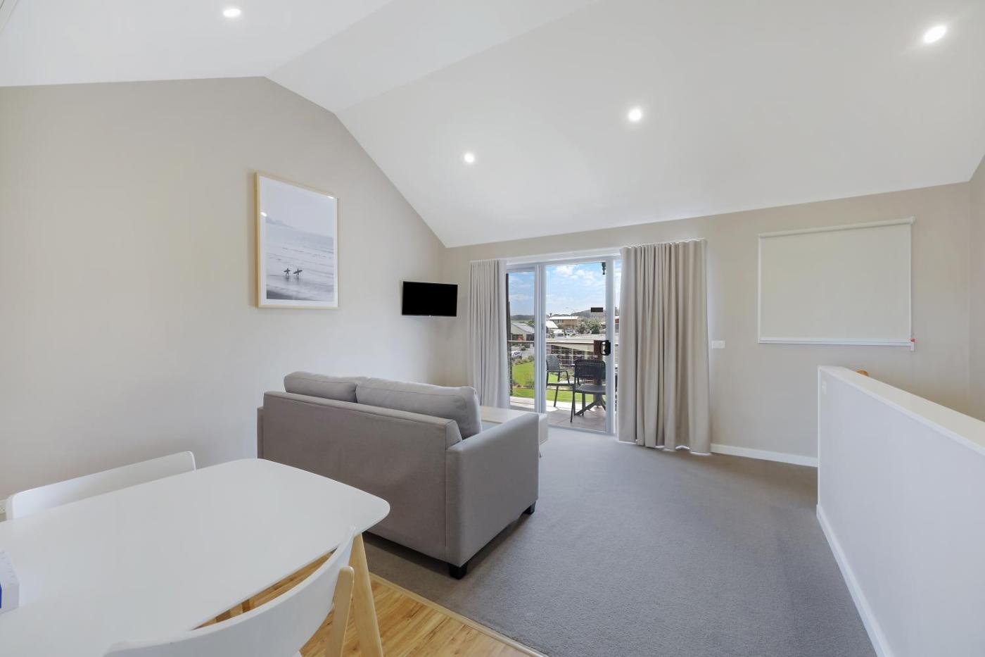 Villa with Sofa Bed - Split Level. This split-level villa offers views across Port Campbell. The upstairs offers a patio with outdoor furniture, a kitchenette and a bedroom with an en suite bathroom. There is also a lounge area with a sofa bed and flat-screen TV. Downstairs offers a patio with outdoor furniture, a kitchen with a dishwasher and a bedroom with an en suite. Please note that there is no capacity for additional guests. The room is accessible only via staris. Includes covered parking for 1 car. ;