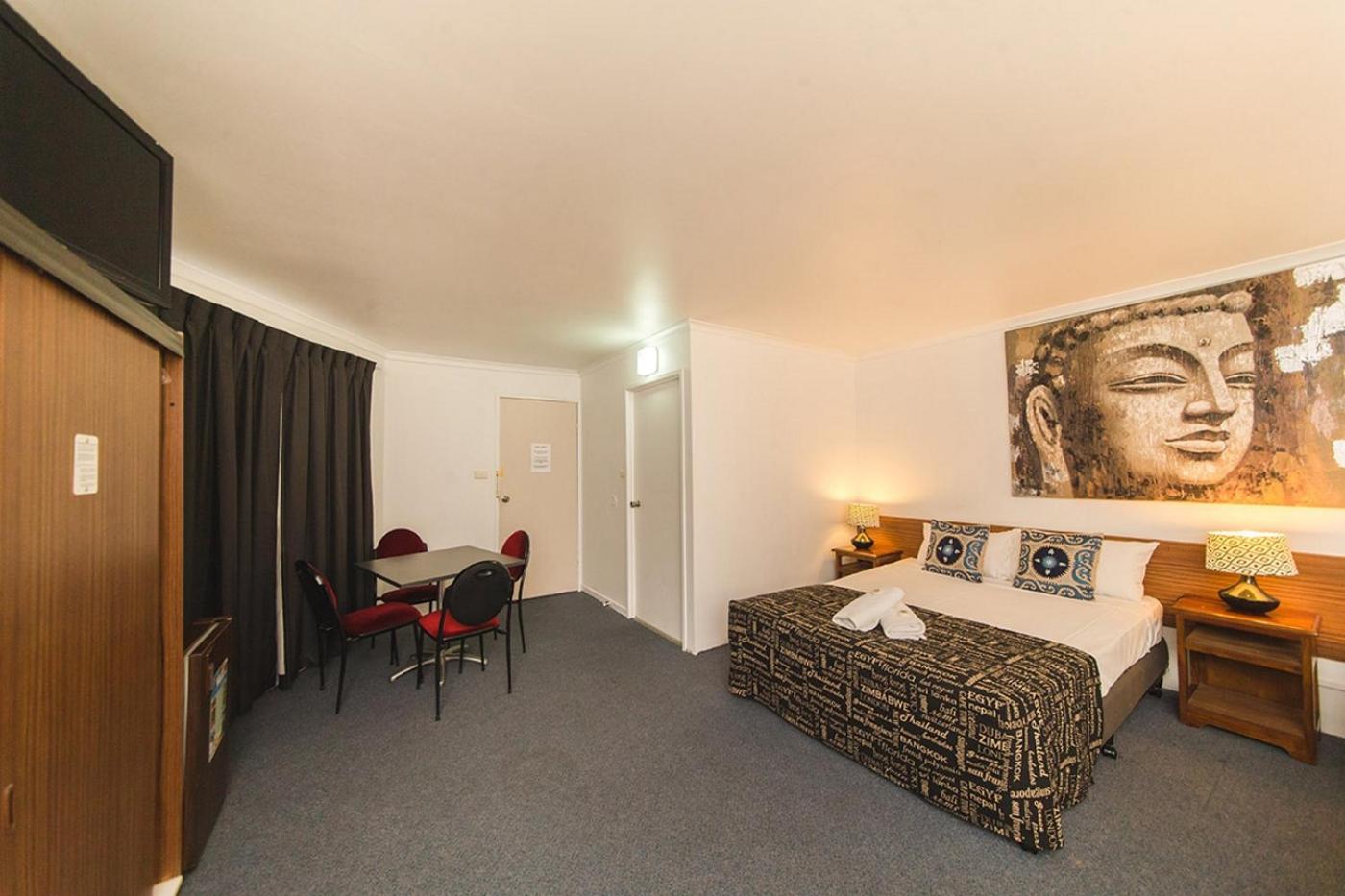 Queen Room with Spa Bath. This spacious air-conditioned room features a flat-screen TV. It includes a refrigerator, toaster and teacoffee making facilities. ;