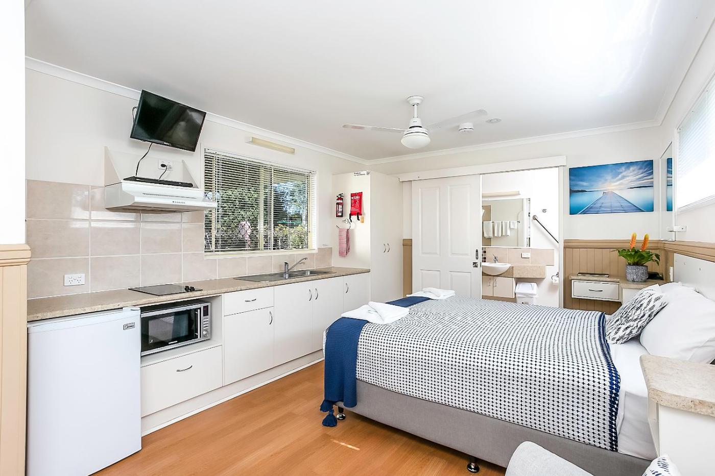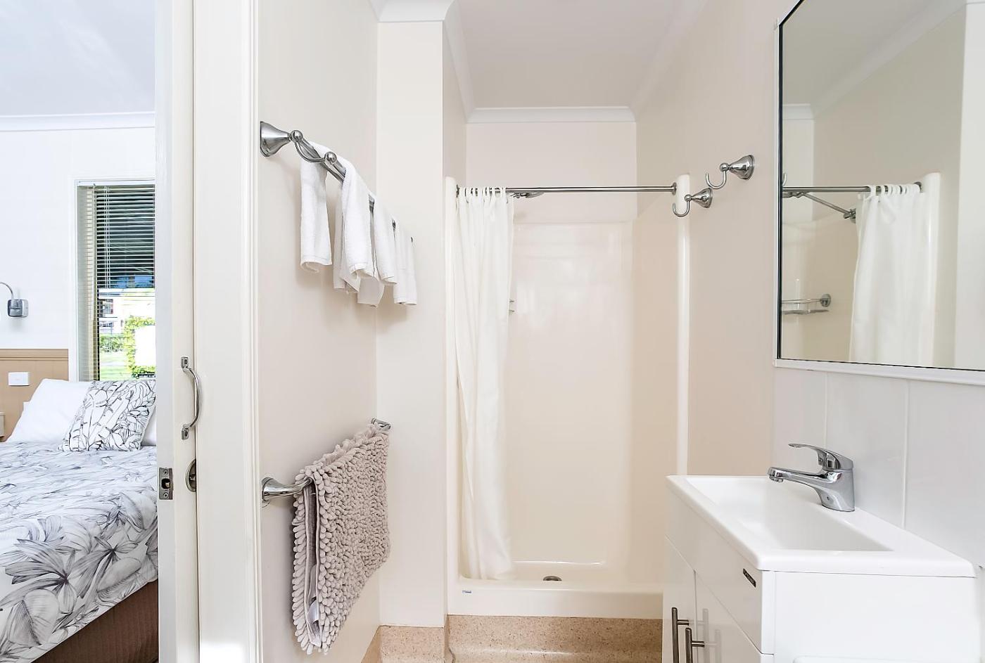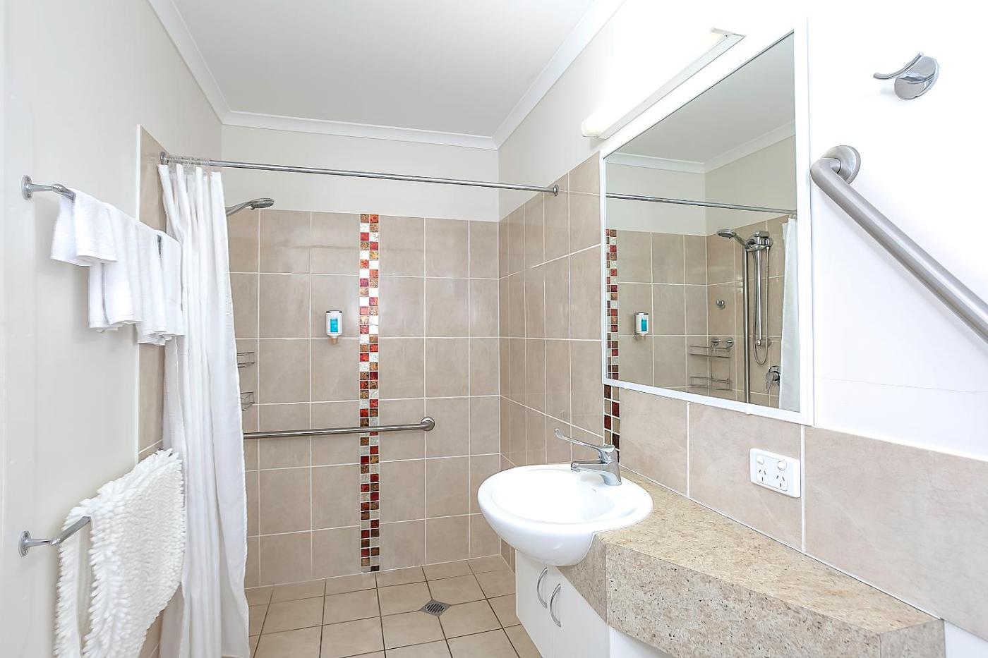 Family Room - Disability Access. The family room features a washing machine, a private entrance, as well as a private bathroom boasting a walk-in shower and a hairdryer. Guests will find a stovetop, a refrigerator, kitchenware and a microwave in the well-fitted kitchenette. The family room also includes a barbecue. This wheelchair accessible family room has air conditioning, a seating area with a flat-screen TV and a roll-in shower. The unit has 2 beds.